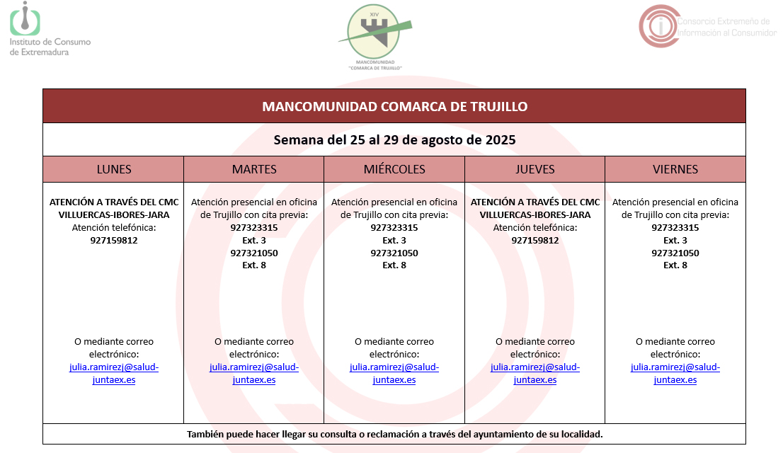 Calendario del Centro Mancomunado de Consumo del 25 al 29 de agosto de 2025. 19 agosto 2025 Calendario del Centro Mancomunado de Consumo del 25 al 29 de agosto de 2025.