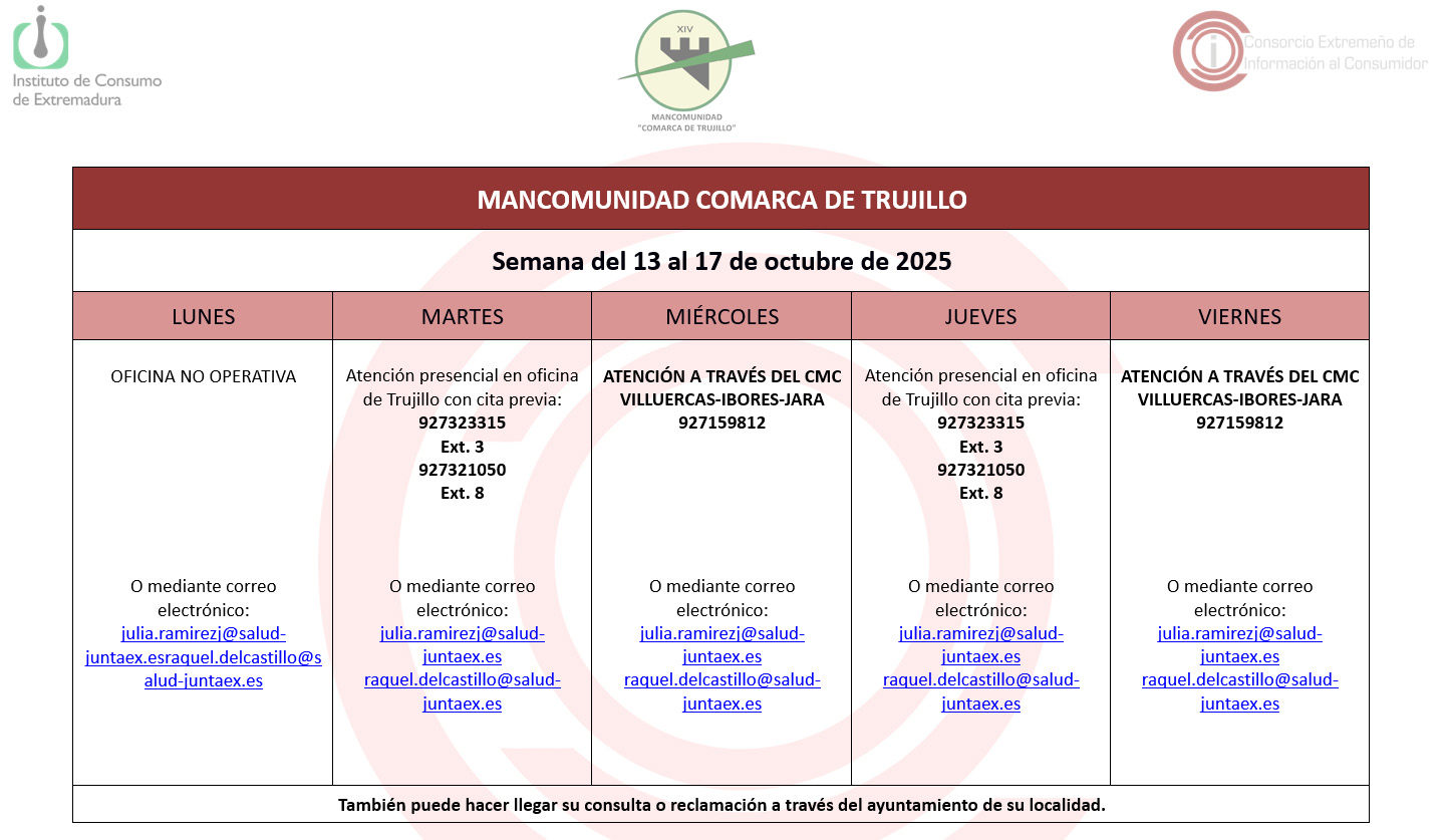 Calendario del Centro Mancomunado de Consumo del 13 al 17 de octubre de 2025. 07 octubre 2025 Calendario del Centro Mancomunado de Consumo del 13 al 17 de octubre de 2025.