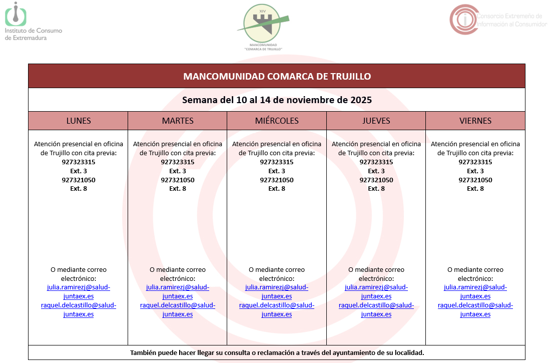 Calendario del Centro Mancomunado de Consumo del 10 al 14 de noviembre de 2025. 05 noviembre 2025 Calendario del Centro Mancomunado de Consumo del 10 al 14 de noviembre de 2025.