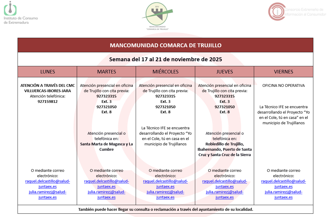 Calendario del Centro Mancomunado de Consumo del 17 al 21 de noviembre de 2025. 13 noviembre 2025 Calendario del Centro Mancomunado de Consumo del 17 al 21 de noviembre de 2025.