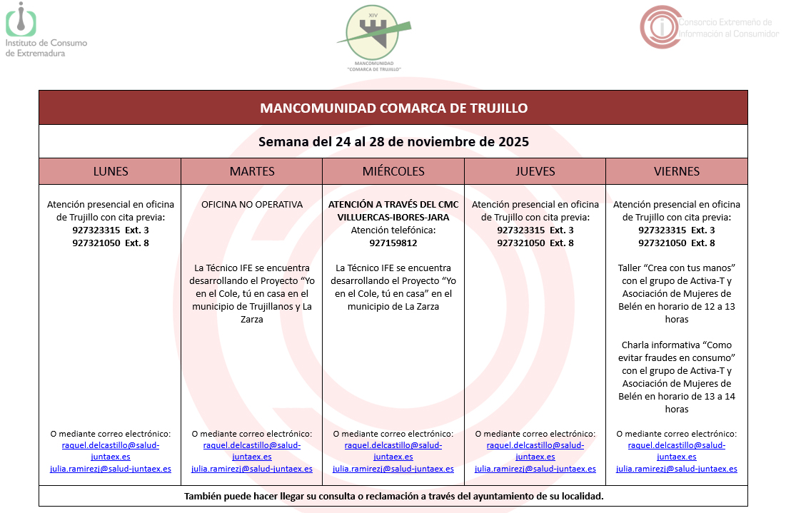 Calendario del Centro Mancomunado de Consumo del 24 al 28 de noviembre de 2025. 19 noviembre 2025 Calendario del Centro Mancomunado de Consumo del 24 al 28 de noviembre de 2025.