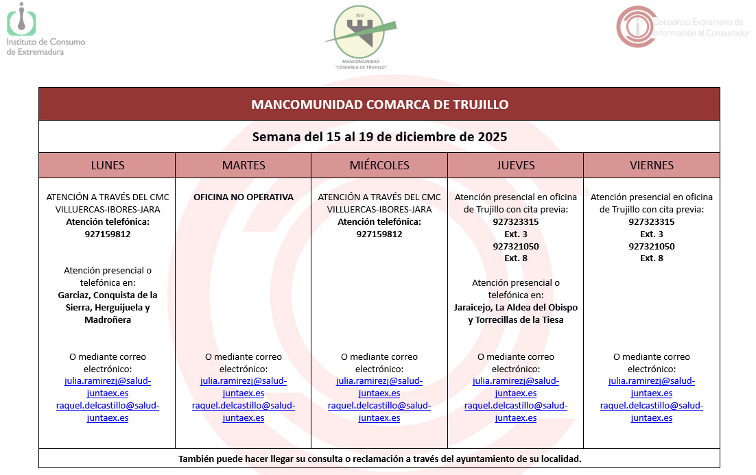 Calendario del Centro Mancomunado de Consumo del 15 al 19 de diciembre de 2025. 11 diciembre 2025 Calendario del Centro Mancomunado de Consumo del 15 al 19 de diciembre de 2025.