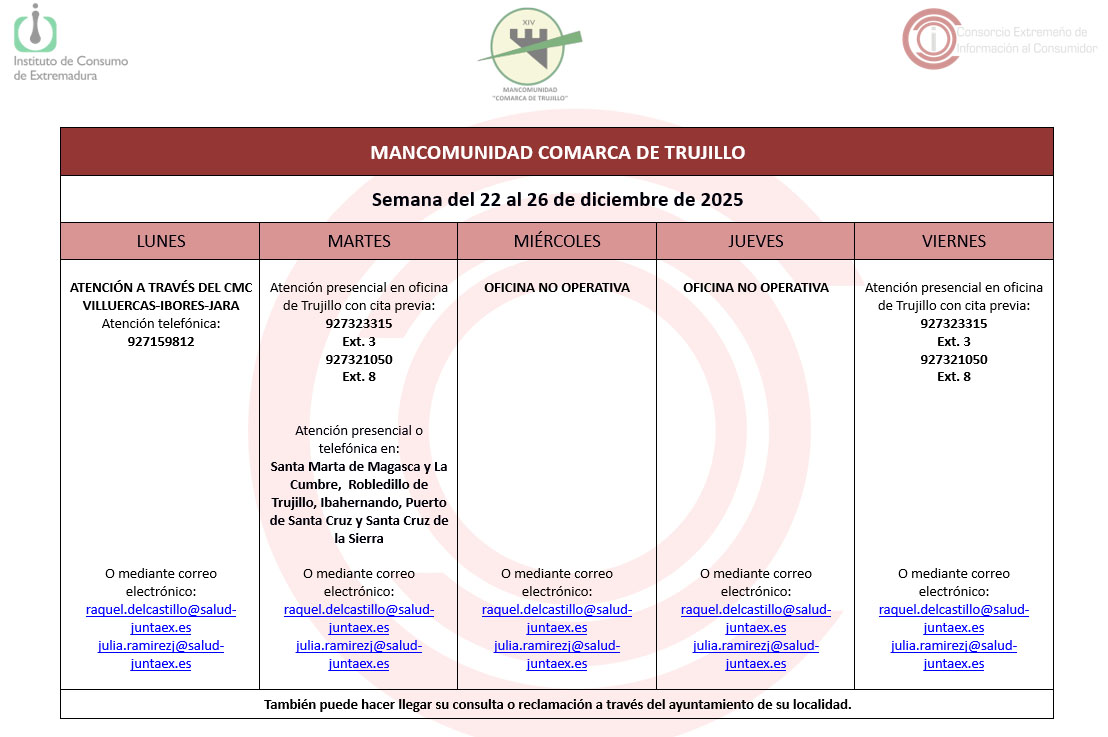 Calendario del Centro Mancomunado de Consumo del 22 al 26 de diciembre de 2025. 19 diciembre 2025 Calendario del Centro Mancomunado de Consumo del 22 al 26 de diciembre de 2025.