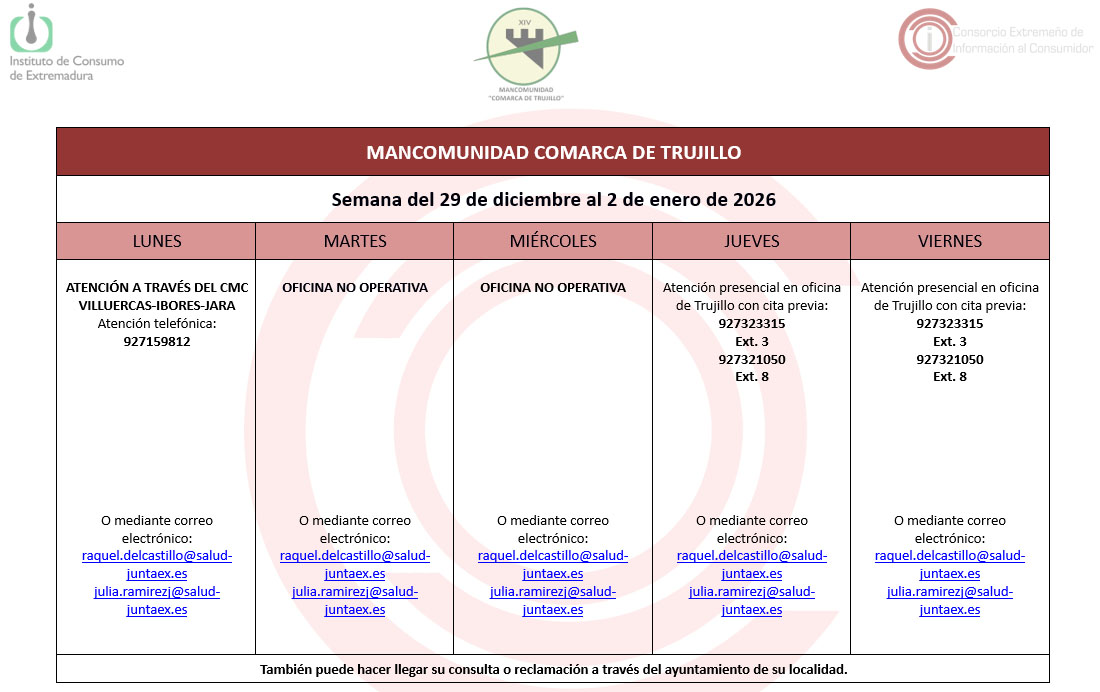 Calendario del Centro Mancomunado de Consumo del 29 de diciembre al 2 de enero de 2026. 23 diciembre 2025 Calendario del Centro Mancomunado de Consumo del 29 de diciembre al 2 de enero de 2026.