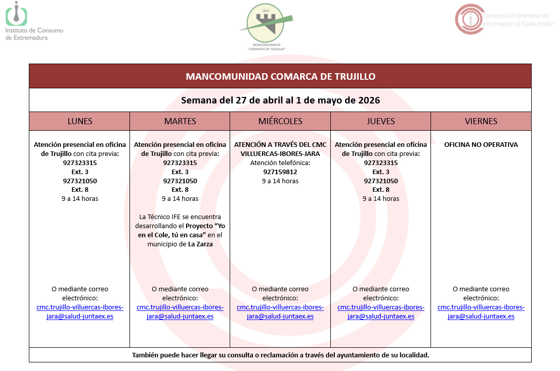 Calendario del Centro Mancomunado de Consumo del 27 de abril al 1 de mayo de 2026. 23 abril 2026 Calendario del Centro Mancomunado de Consumo del 27 de abril al 1 de mayo de 2026.